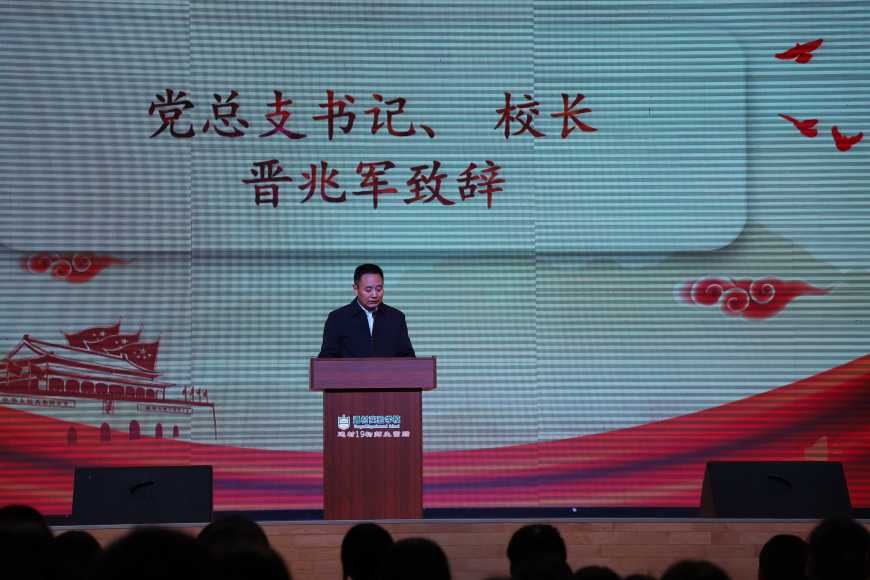 随后,校党总支书记、校长晋兆军致辞,晋校长对新加入团组织的同学们表示热烈的祝贺,并强调了团组织对青年成长的重要作用。他希望新团员们和青年们能够牢记入团誓言,以实际行动践行团员的责任和义务,为祖国的繁荣富强贡献自己的力量。