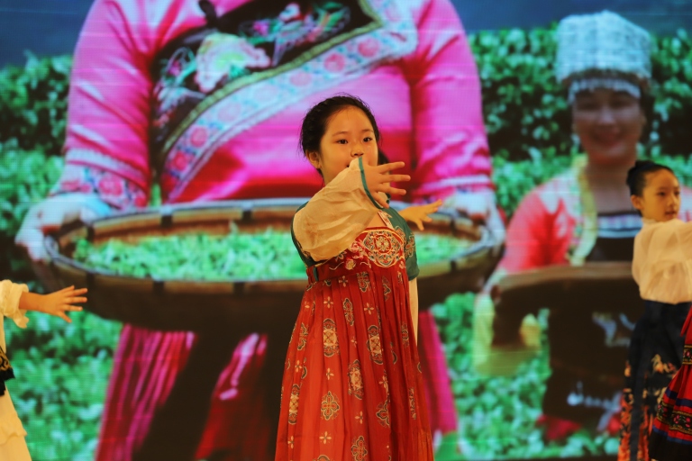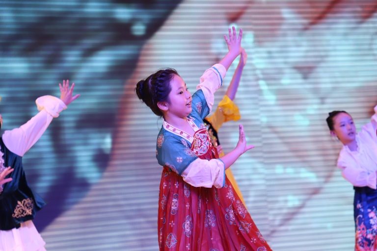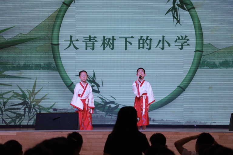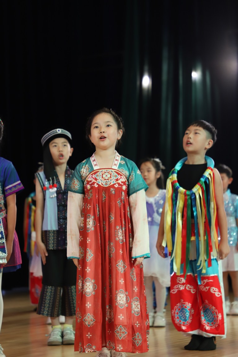 升旗仪式后,三年级二班带了精彩的班级风采展示。在悠扬的音乐声中,身着色彩绚丽的不同民族服饰的同学们,载歌载舞,仿佛将大家带进了那所充满快乐与团结的“大青树下”的边疆小学。