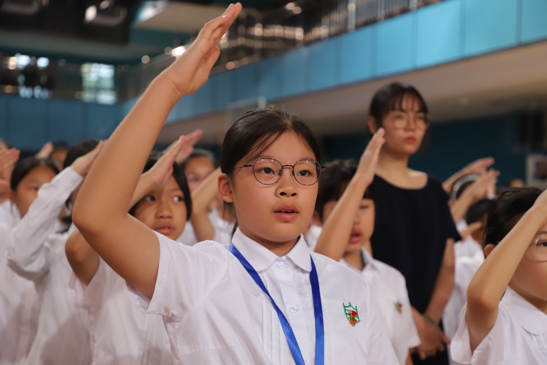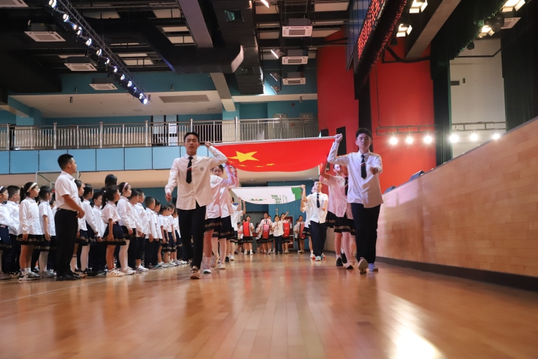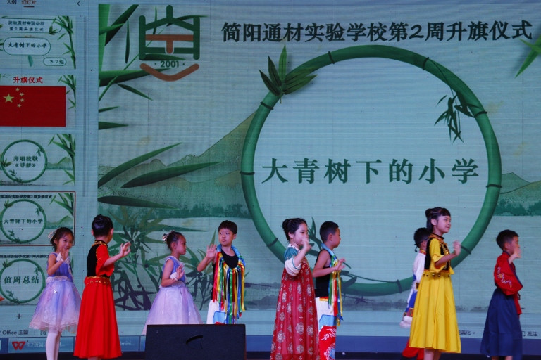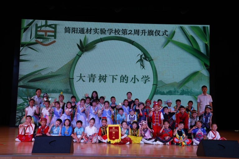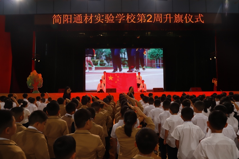 2025年9月8日,简阳通材实验学校三年级二班青竹班的全体同学,在我校艺体馆举行了以“民族团结一家亲,'童'心共筑中国梦”为主题的特色升旗仪式。