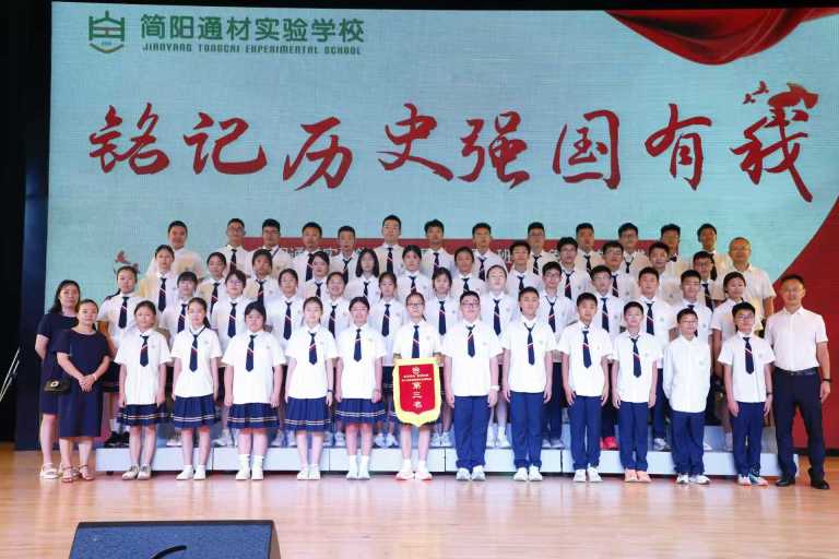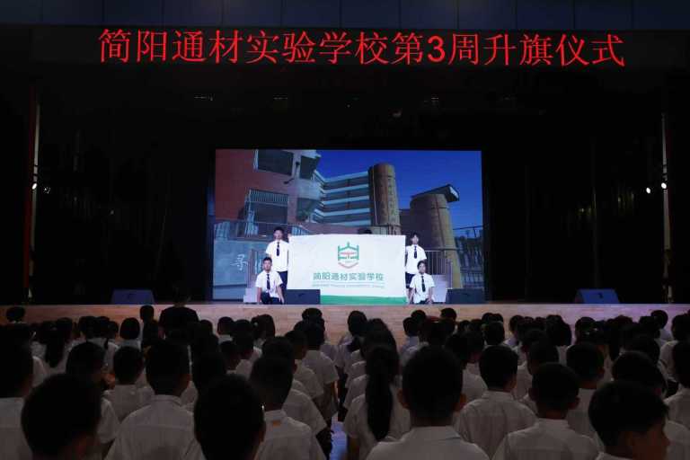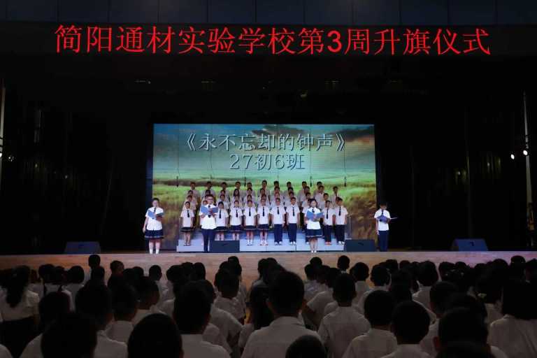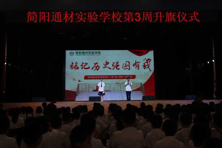 2025年9月15日,简阳通材实验学校第三周升旗仪式在艺体馆三楼隆重举行。本次仪式以“铭记历史,强国有我”为主题,由27初6班负责承办,全体师生共同参与,气氛庄重而热烈。