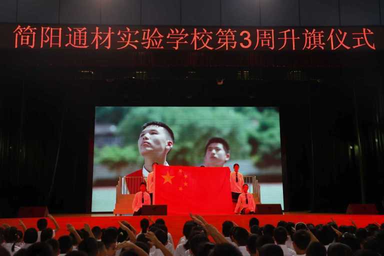 在庄严的国歌声中,全体师生肃立,高唱国歌,少先队员行队礼,其余师生行注目礼,注视着五星红旗冉冉升起。随后,师生齐唱校歌《寻梦》,歌声嘹亮,展现了通材师生良好的精神风貌。
