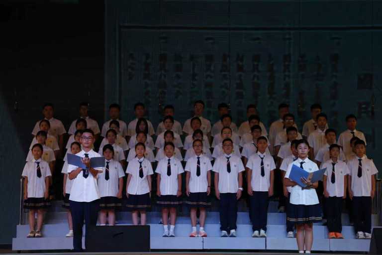 接下来是27初6班学生带来了精彩的班级风采展示。诗朗诵《永不忘却的钟声》,带领大家回顾了“九一八”事变那段沉痛的历史,讲述了中华民族曾经的苦难与不屈的抗争。朗诵情感真挚、气势恢宏,深深打动了在场的每一个人。紧接着,合唱《强国有我》将现场气氛推向高潮,表达了新时代青少年牢记使命、奋发图强的坚定决心。