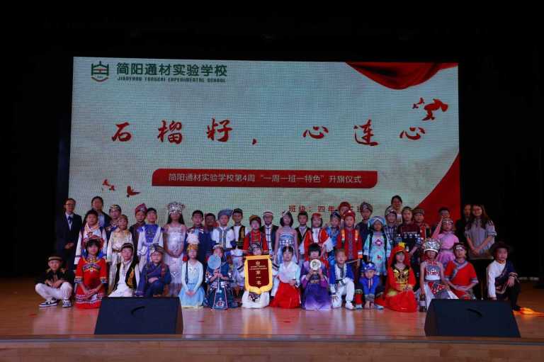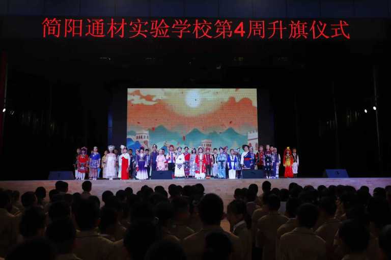 2025年9月22日,简阳通材实验学校艺体馆内氛围庄重而热烈,四年级三班的全体同学在此举行了以“石榴籽,心连心”为主题的特色升旗仪式,用鲜活的形式传递民族团结的深厚内涵。