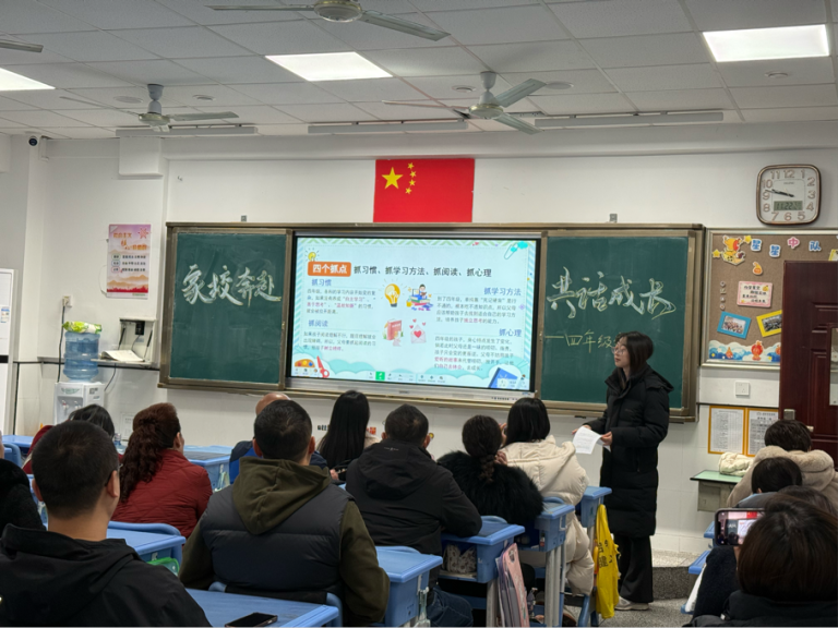 四年级家长会直面学生成长新挑战。教师系统梳理了学生在学习、心理、行为、生活上的突出问题:学习态度波动大、缺乏自主能力;心理抗挫折能力弱;课堂自律性差、人际交往易冲突;生活过度依赖家长。针对这些问题,给出精准指导:学习上引导孩子制定计划,培养预习复习习惯;心理上通过平等对话建立积极的挫折观;行为上家校协同强化课堂纪律,组织集体活动助力内向学生融入;生活上督促孩子自主整理书包、制定课余时间表,逐步摆脱依赖。